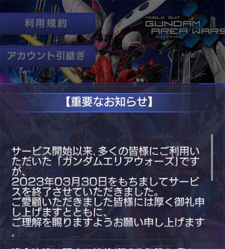 とうとう来るべき時が来た、 らしい。 取り急ぎ、悲しいよと伝えたかったので更新しました。まだまだ面白くできるコンテンツだっただけに残念無念。 さ終したらもうこのアプリは触らなくなるのだろうか?責めて集めた機体だけでも愛でることができますように…